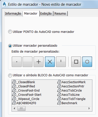 Os Estilos de marcador podem ser definidos para usar pontos do AutoCAD, símbolos personalizados do marcador ou blocos.