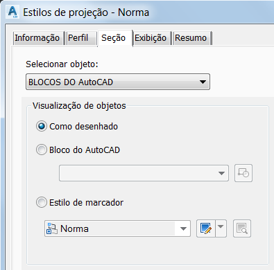 Se você desejar incluir dados de conjunto de propriedades em estilos de legenda de projeção, você precisa selecionar o tipo de objeto Legenda de seção de projeção além do tipo de objeto cuja projeção é mostrada no gráfico de seção.