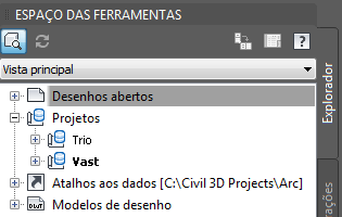 A Vista principal da Árvore do Prospector contém quatro coleções relacionadas a projetos e desenhos: Abrir, projetos, atalhos de dados e modelos de desenho.