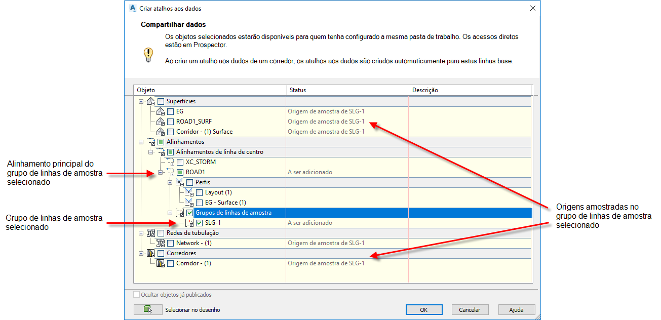 Quando você criar um atalho aos dados para um grupo de linhas de amostra, serão exibidas notas na coluna Status da caixa de diálogo Criar atalhos aos dados para informar que itens do desenho são origens amostradas do grupo de linhas de amostra.