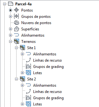 Cada coleção de topologia de terreno contém coleções para alinhamentos, nivelamentos e lotes:
