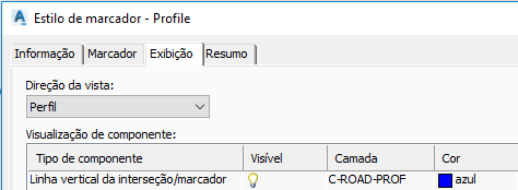 O componente Linha vertical da interseção/marcador controla a exibição do marcador (usado para exibir perfis de interseção, linhas de recurso, imagens do levantamento topográfico e polilinhas 3D) e da linha vertical da interseção (usada para exibir interseções de alinhamento).