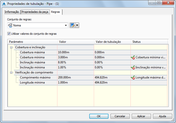 A ilustração a seguir é um exemplo da guia Regras em uma tubulação em um desenho. Neste exemplo, as propriedades de Cobertura mínima e Comprimento máximo para essa tubulação exibem o texto descritivo de violação de regra na coluna Valor da tubulação, já que violam os critérios de projeto especificados na coluna Valor. Observe texto descritivo da violação de regra exibida na coluna Status; por exemplo, “Cobertura mínima da tubulação excedida” e “Excede o comprimento máximo da tubulação em”.