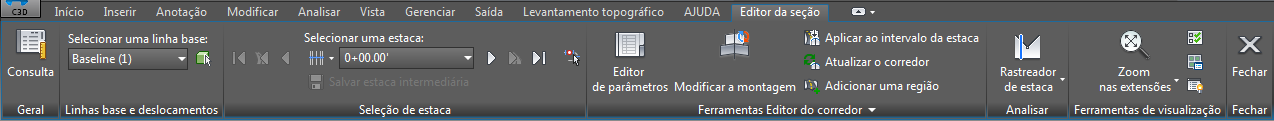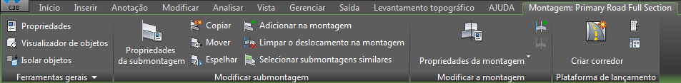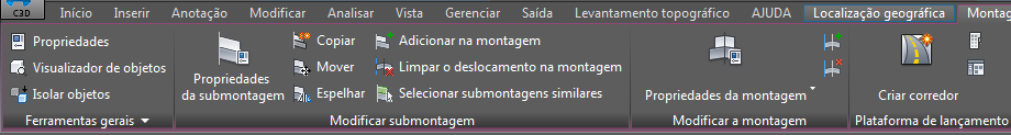 Guias contextuais que são exibidas quando você não seleciona um objeto têm um fundo de cor roxo. Por exemplo, se você clicar no botão montagem na guia Modificar, a guia contextual de objeto não selecionado na montagem exibe um de plano de fundo na cor roxa. Isto fornece o acesso a todos os comandos relacionados às montagens sem precisar selecionar uma montagem no desenho.