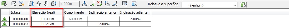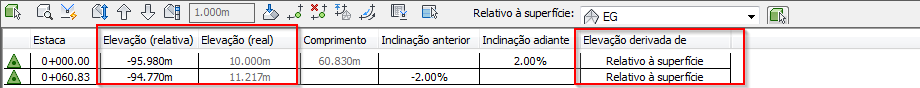 Se for alterado para ser relativo à superfície EG, a elevação real permanece a mesma e a coluna Elevação (relativa) mostra a diferença de elevação entre a linha de recurso e a superfície.