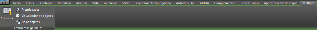 Quando vários tipos de objetos são selecionados simultaneamente, a guia contextual múltipla é exibida na faixa de opções. Por exemplo, se você selecionar um objeto de rede de tubulação e um objeto de alinhamento, a guia contextual múltipla é exibida.