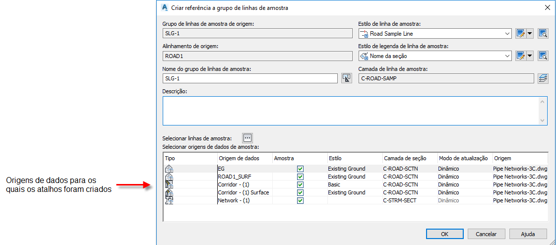 Quando você selecionar essas origens de dados para realizar a amostragem e clicar em OK, as referências às origens amostradas serão criadas no desenho, caso ainda não existam. Para obter mais informações, consulte Sobre referências de atalhos a dados de grupos de linhas de amostra.