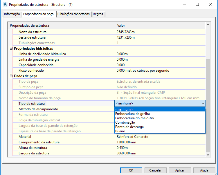 A propriedade Tipo de estrutura também controla as outras propriedades que são exibidas na caixa de diálogo. Por exemplo, se você selecionar qualquer tipo de embocadura, as propriedades dos detalhes da sarjeta e das dimensões da embocadura se tornarão disponíveis.