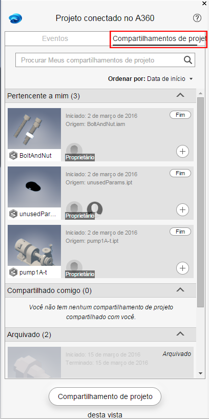As ferramentas para gerenciamento de Compartilhamentos de projetos, anteriormente apenas disponíveis em seu A360 drive, estão agora também disponíveis no Inventor. Elas estão localizadas no painel Projeto conectado no A360, na nova guia Compartilhamentos de projetos. Os proprietários de Compartilhamentos de projetos agora podem gerenciar os Compartilhamentos de projetos diretamente no Inventor.