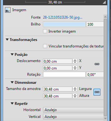 - No Editor de textura, é possível: alterar imagens e modificar valores de Posição, Escala e Repetição. Neste exemplo, a Escala precisa ser modificada.