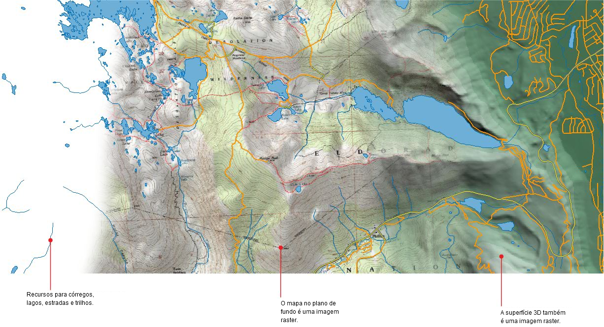 Ao criar um mapa, você pode adicionar imagens raster e superfícies para a exibição.