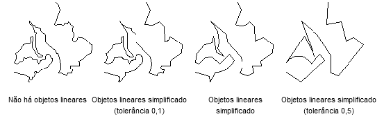 Quando os mapas são digitalizados, as arestas podem ser definidas com mais detalhes do que o necessário. Utilize Simplificar objetos para reduzir a complexidade desnecessária em linhas de contorno, rios e coastlines. A simplificação de objetos, também conhecida como generalização ou erradicação reduz o número de pontos em uma linha complexa.