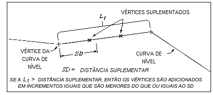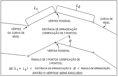 Um ponto em uma polilinha 3D é erradicado calculando sua localização em relação aos vértices antes de depois do mesmo. Se o comprimento entre estes três pontos for menor do que o valor de comprimento de erradicação e o ângulo de deflexão for menor do que o valor do ângulo de erradicação, o ponto central não é adicionado ao arquivo de dados de contorno.