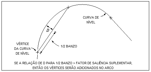 Para curvas, o valor da saliência é a relação entre a distância do arco até a corda dividida pela metade do comprimento da corda. O fator de saliência acrescenta vértices a uma curva de polilinha, criando uma aproximação da curva usando segmentos de linha reta. O comprimento dos segmentos varia dependendo do fator de saliência e o grau de curvatura.