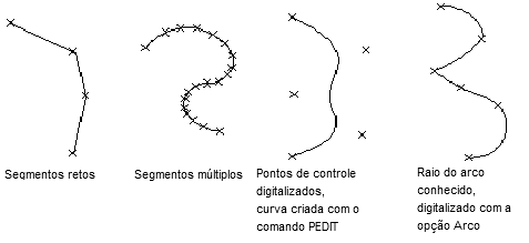 - Ao digitalizar curvas irregulares com PLINE ou MAPDIGITIZE, o espaçamento dos pontos de vértice selecionados irão depender da curvatura da linha. Segmentos mais retos requerem menos pontos.