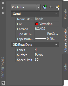 Ao selecionar um objeto criado usando a classificação do objeto, as propriedades que estão associadas com classe de objeto serão exibidas na guia Classe de objeto na paleta Propriedades. Por exemplo, ao selecionar uma estrada, a paleta Propriedades mostra a camada, espessura da linha, tipo de superfície e número de pistas. Editar propriedades ao inserir novos valores na janela.