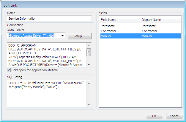 - Selecione a caixa de seleção Hold Open for Application Lifetime se desejar manter aberto o link do banco de dados até você sair do Autodesk Navisworks.