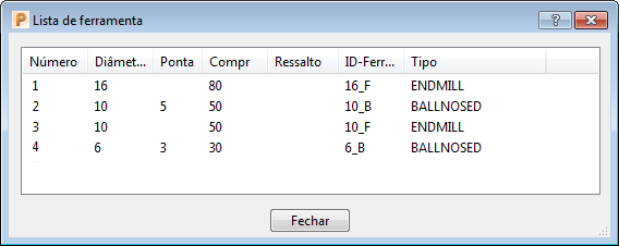 Você pode exibir todas as Ferramentas utilizadas num Programa NC, e os parâmetros utilizados para criar as Ferramentas.