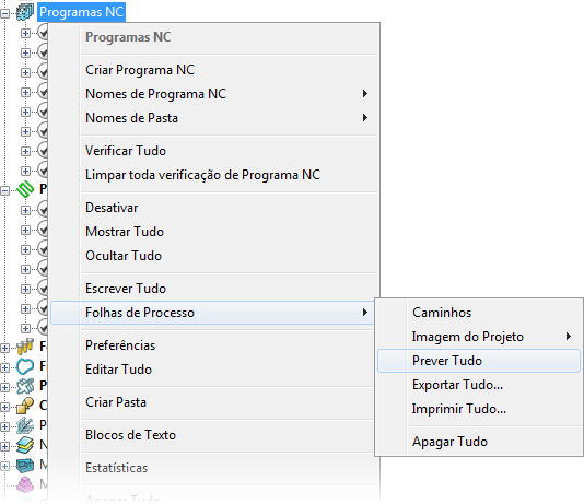 1. Clique com o botão direito em Programas NC, e selecione Folhas de Processo > Prever Tudo.