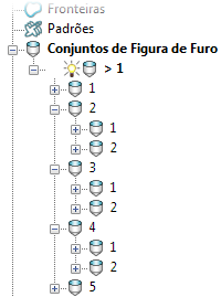 Neste exemplo existem dois furos padrão e três furos compostos. Os furos compostos são exibidos em cor-de-laranja.