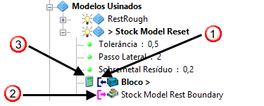 Quando uma entidade é aplicada a um modelo usinado, produz um Estado do Modelo Usinado. Isso representa o estado do bloco material em um ponto em particular no processo de usinagem e é definido pelas operações das entidades atualmente aplicadas no modelo usinado.