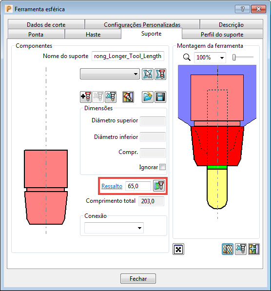 Montagem da Ferramenta — Essa área exibe as porções definidas da montagem da ferramenta além do perfil do suporte.