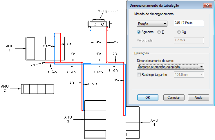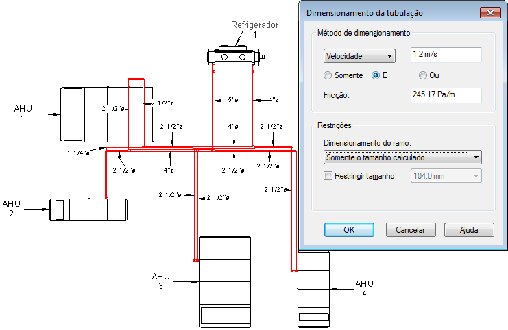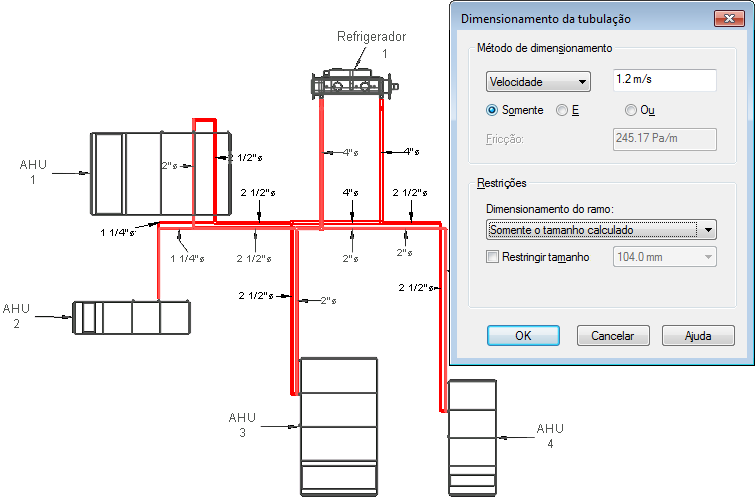 As imagens a seguir mostram os resultados dos diversos métodos de tamanho de tubulação hidrônica.