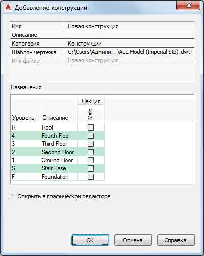 приписать конструкцию к уровню и секции, выберите в таблице назначений соответствующие уровень и секцию. Выберите требуемую строку уровня и столбец секции и отметьте соответствующую ячейку.
