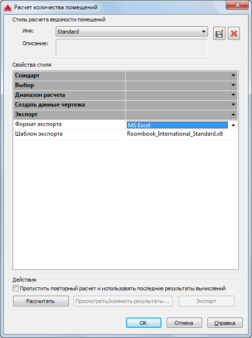 2. В диалоговом окне "Расчет количественных характеристик помещения" в разделе "Свойства стиля" в списке "Экспорт" выберите MS Excel в списке "Формат экспорта".