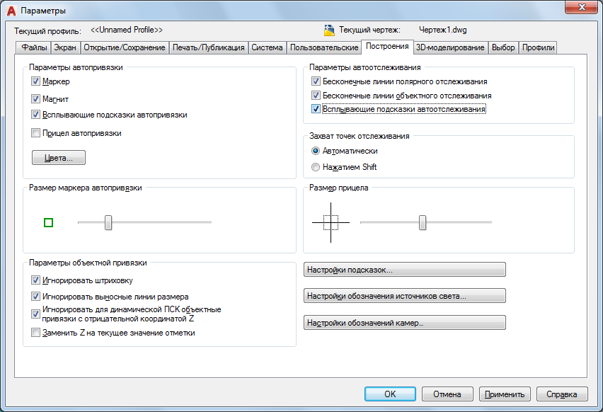 Управление параметрами автоотслеживания (AutoTrack ™ ). Автоотслеживание активизируется при включении полярного или объектного отслеживания (см. описание команды РЕЖИМРИС).