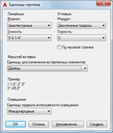 Возможно использование следующих форматов: "Архитектурные", "Десятичные", "Инженерные", "Дробные" и "Научные". Для форматов "Инженерные" и "Архитектурные" линейные величины выражаются в футах и дюймах; при этом единица чертежа соответствует одному дюйму. Остальные форматы могут представлять любые существующие единицы.