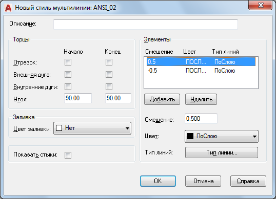 Отображает все элементы текущего стиля мультилинии. Для каждого элемента стиля определяется смещение от центра мультилинии, цвет и тип линии. Элементы отображаются в убывающем порядке значений смещений.