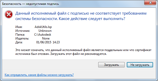 При загрузке файла пользовательской программы с цифровой подписью программа на основе AutoCAD проверяет цифровую подпись, добавленную к файлу. Отображается сообщение о проверке цифровой подписи, которое позволяет пользователю загружать или не загружать файл программы в среду чертежа.