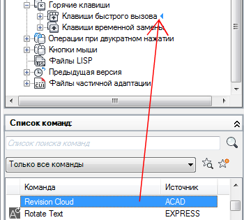- Чтобы создать клавишу быстрого вызова, перетащите команду с панели "Список команд" в узел "Клавиши быстрого вызова" на панели "Адаптации: <имя файла>".
