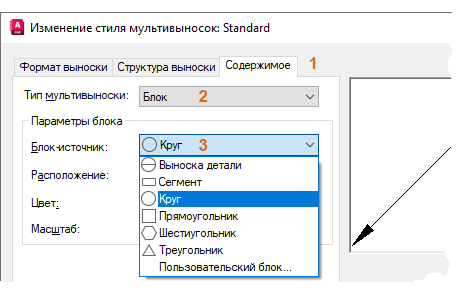 3. Перейдите на вкладку «Содержимое» (1), измените тип мультивыноски с «Мтекст» на «Блок» (2). Для параметра «Блок-источник» выберите «Круг» (3). Затем нажмите "OK".