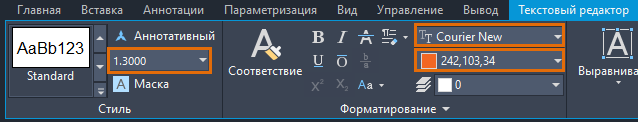 На контекстной вкладке ленты «Текстовый редактор» выполните следующие действия, чтобы изменить форматирование символов многострочного текста.