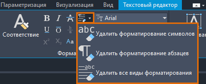 На контекстной вкладке ленты «Текстовый редактор» на панели «Форматирование» нажмите кнопку «Очистить» и выберите один из следующих параметров: