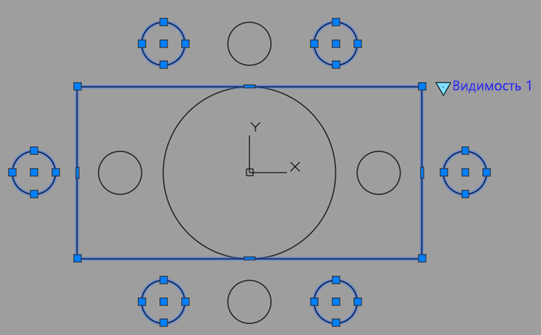 С помощью состояний видимости можно создать блок с любым количеством различных конфигураций. В этом примере рассматривается создание блока, который может представлять собой либо круглый стол с четырьмя стульями, либо прямоугольный стол с восемью стульями.