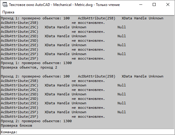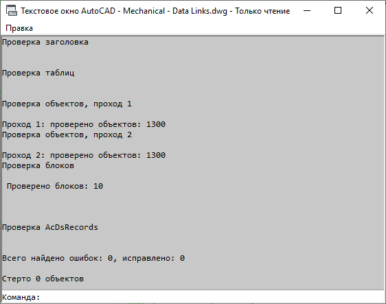 Чтобы ознакомиться с подробным отчетом о результатах проверки, нажмите сочетание клавиш CTRL + F2, чтобы открыть текстовое окно AutoCAD, или клавишу F2, чтобы развернуть окно командной строки.