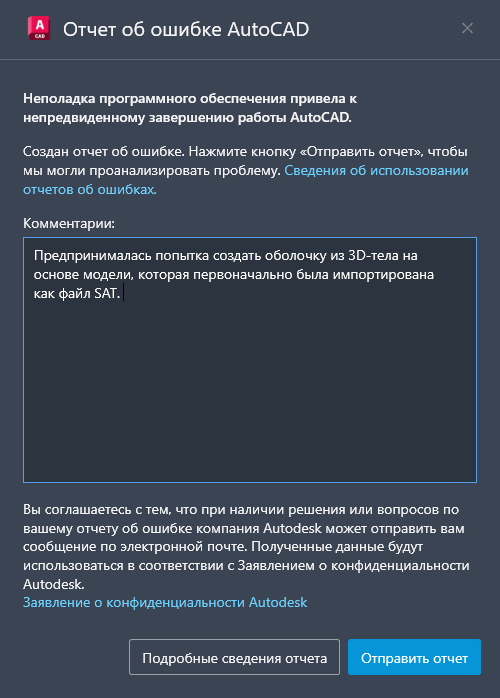 Ниже приведено диалоговое окно «Отчет об ошибке AutoCAD» с дополнительными сведениями.