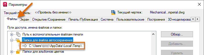 Внимание: Таймер автосохранения сбрасывается при каждом сохранении чертежа, поэтому AutoCAD может и не создать файл автосохранения (SV$) для открытого чертежа. Например, если интервал автосохранения установлен на 10 минут, а вы сохраняете файл каждые 2–5 минут, файл SV$ не будет создан.