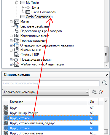 4. Перетащите команду, которую требуется добавить, с панели "Список команд" на всплывающее меню панели инструментов, расположенное на панели "Адаптации: <имя файла>".