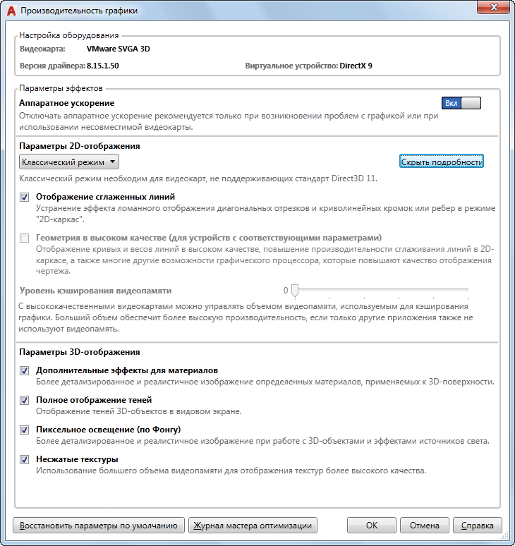 - Настройка представления 2D-параметров, таких как «Отображение сглаженных линий» и «Высококачественная геометрия». По умолчанию параметры отображения сглаженных линий, высококачественной геометрии и объема кэша видеопамяти свернуты. Для отображения данных параметров щелкните кнопку «Подробности».