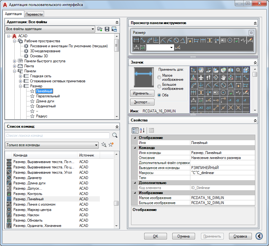 Отображает интерфейс для настройки рабочих пространств, панелей инструментов, меню, панелей ленты, контекстных меню и других элементов интерфейса пользователя.