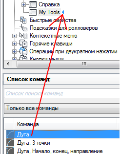 - Перетащите команду, которую требуется добавить, с панели "Список команд" в контекстное меню, расположенное на панели "Адаптации: <имя файла>".
