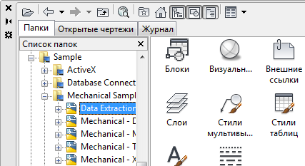 Вкладки «Папки», «Открытые чертежи» и «Журнал» обеспечивают различные способы доступа к содержимому.