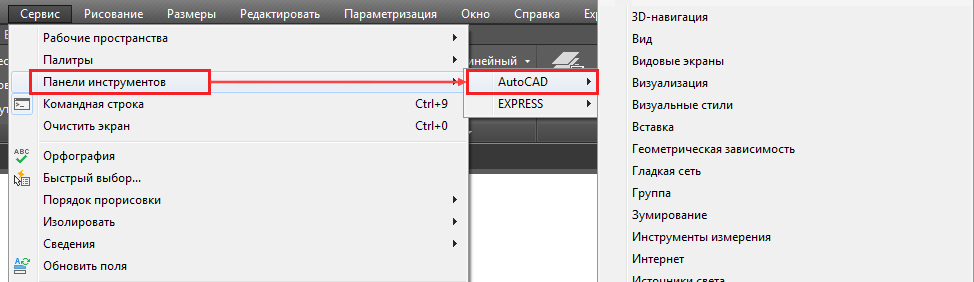 2. Для отображения панели инструментов перейдите в меню «Сервис» > «Панели инструментов» и выберите нужную панель инструментов.