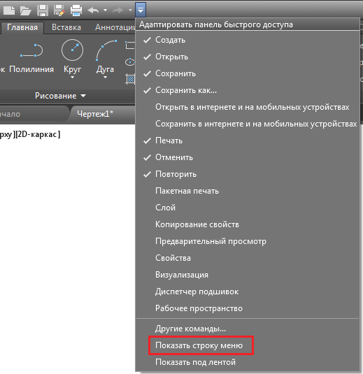 1. Чтобы включить отображение меню, щелкните раскрывающееся меню панели "Быстрый доступ" > Показать строку меню.