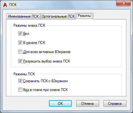 Отображение знака ПСК на текущем видовом экране в точке начала координат. Если убрать этот флажок (или если начало ПСК находится за пределами видового экрана), знак ПСК располагается в левом нижнем углу видового экрана.