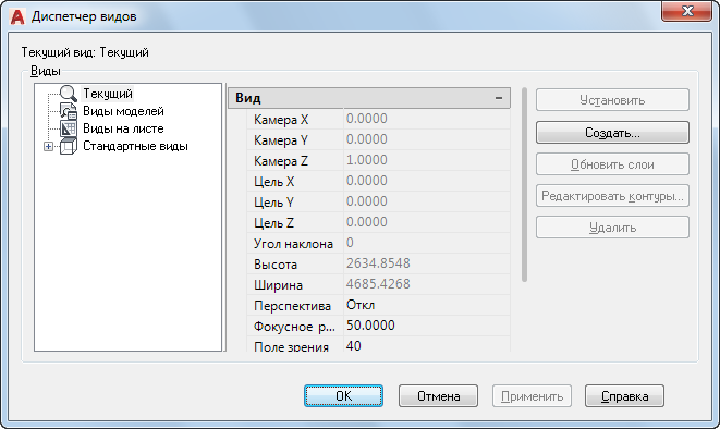 • Текущий. Отображается текущий вид и указываются его свойства "Вид" и "Сечение".
